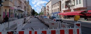 Rückschau: Im ersten Halbjahr des Jahres 2025 hat das Straßen- und Grünflächenamt (SGA) bzw. das Tiefbauunternehmen begonnen, zwischen der Weißenburger und der Franzstraße den Gehwegbereich zu erneuern. Weiterhin betraf die Baustelle größtenteils den Gehwegbereich, der Verkehr wurde seitlich vorbeigeführt. Dazu wurde die Baustelleneinrichtung auf die östliche Seite verlagert.Zuerst wurden die Gasleitungen in den Monaten Mai bzw. Juni erneuert. Anschließend haben die Berliner Wasserbetriebe (BWB) Regenwasserabläufe und einen Schacht erneuert. Dann wurden die Hochborde gesetzt. Aktuell wird der neue Oberflächenbelag im Gehweg verlegt – in der Gehbahn und als Mosaikpflaster im Ober und Unterstreifen. Dann sind die Arbeiten im Gehwegbereich abgeschlossen.Zuletzt