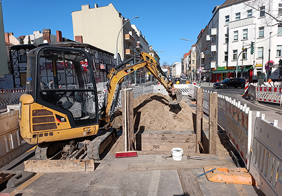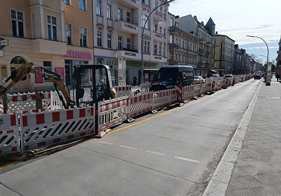 Am 26. Februar 2026 hat das Tiefbauunternehmen M. Hajek die Baustelleneinrichtung angepasst: nun ist in der Fahrbahnmitte ab Höhe Franzstraße bis Weißenburger Straße ein Baustellenbereich mit Baken abgegrenzt. Der Verkehr wird jeweils links und rechts vorbeigeführt. Aktuell haben die BWB bzw. die Reddemann Rohrbau Schachtarbeiten begonnen. Diese Arbeiten werden voraussichtlich Ende März abgeschlossen.